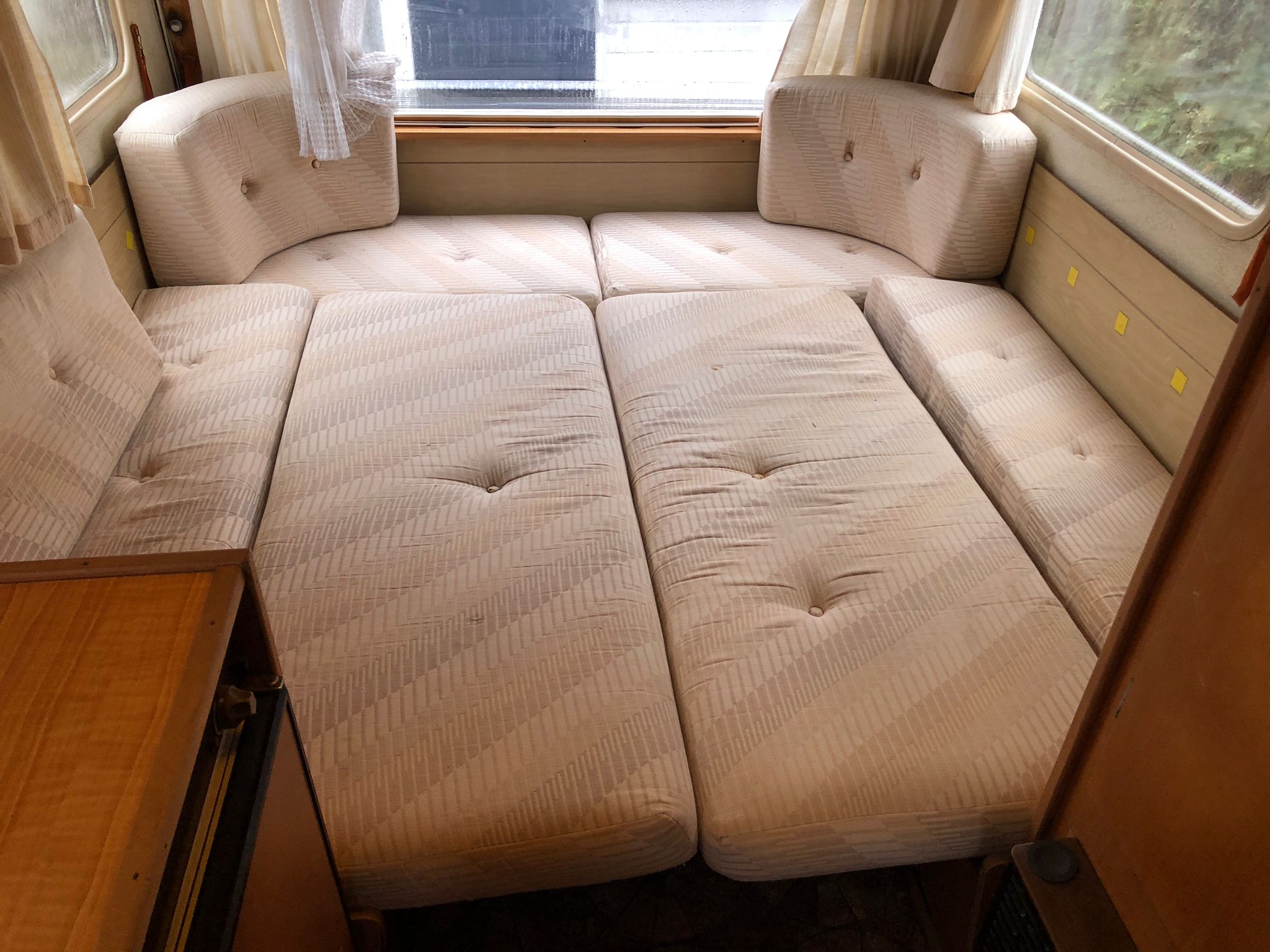 De indeling is overzichtelijk en comfortabel. Aan de achterzijde bevindt zich een ruime rondzit die eenvoudig is om te bouwen tot een royaal tweepersoonsbed van circa 1,90 x 1,90 meter. Dat zorgt voor verrassend veel slaapruimte binnen een compacte caravan.